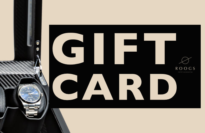Sind Sie auf der Suche nach dem perfekten Geschenk für den Uhrenliebhaber in Ihrem Leben? Zu viel Auswahl? Die ROOGS Geschenkkarte im Wert von 100, 200, 500 oder 1000 Euro ist die perfekte Lösung. Mit dieser tollen Geschenkkarte kann der Empfänger aus Hunderten von Uhrenbewegern, Uhrenboxen, Uhrenständern, Reisekoffern und vielem mehr wählen.